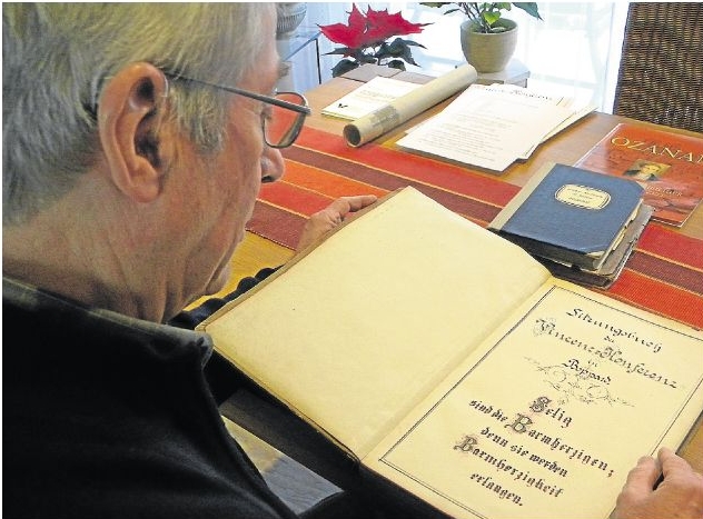 Gerhard Schäfer, Vorsitzender der Bopparder Vinzenz-Konferenz, nimmt das erste Sitzungsbuch von 1890 zur Hand.